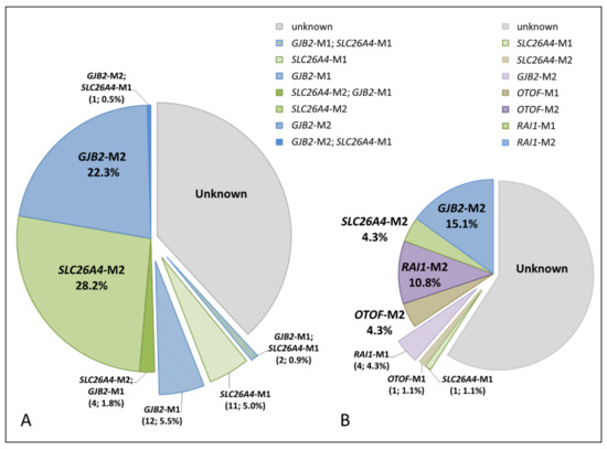 The genetic causes of HL in Tuvinian (A) and Altaian (B) patients. SLC26A4-M2 and SLC26A4-M1—biallelic and monoallelic SLC26A4 mutations, respectively; GJB2-M2 and GJB2-M1—biallelic and monoallelic GJB2 mutations, respectively; RAI1-M2 and RAI1-M1—biallelic and monoallelic mutation c.5254G>A (p.Gly1752Arg) in the RAI1 gene, respectively; OTOF-M2 and OTOF-M1—biallelic and monoallelic mutation c.1111C>G (p.Gly371Arg) in the OTOF gene, respectively; unknown—no pathogenic variants were found in the studied genes. The pie chart area is proportional to the size of each examined group.