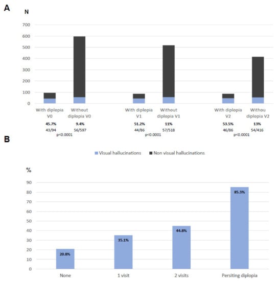 (A) Number of patients reporting visual hallucinations at V0, V1, and V2 when they were divided in patients with vs. without diplopia. (B) Percentage of patients reporting visual hallucinations at least once during the follow-up according to the times who reported diplopia.