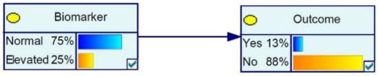 BBN with two nodes in an unobserved state, with Outcome being conditionally dependent on Biomarker state. Using GeNIe software Version 2.3 Graphical User Interface (GUI), the BBN is built up relationship by relationship and can immediately produce predictions based on observed or unobserved states using built-in functionality.