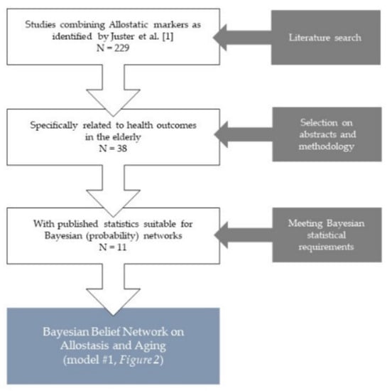 For every included study, the following criteria were used to establish eligibility for our modeling efforts: studies should include a (sub)sample of subjects >60 years of age; should incorporate at least one of the 26 allostatic parameters as published by Juster []; and should report accurate statistics for Bayesian modelling methods (prevalence of states prior and posterior, and risk ratio (RR) or odds ratio (OR) related to the state of the defined parameter following disease onset). For these reasons, the studied allostatic (bio)markers should be related to the development over time of well-defined health outcomes, for example type II diabetes, stroke, or long-term mortality. The identified syndromes and/or disease types were imputed as separate nodes in the probabilistic model as they were considered to contribute significantly to “disturbed allostasis”, or the retrospective conformation of an “allostatic load” having been building up.