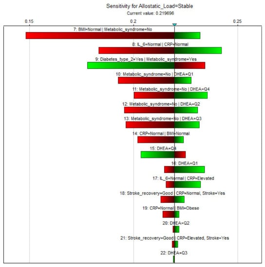 In Figure 4, a visual representation of specific states of nodes on the outcome of the model being stable is presented. Stable means a (on average) static and low-to-absent allostatic load, indicating the likelihood of a generally good overall health, given the defined states of the associated parameters. The influence of the various medical outcomes and conditions were ignored, since they are seen as intermediate outcomes of our model and as such should exert a disproportionately large influence on the model. Following from previous published statistics the most influential parameters on allostatic load in the elderly appear to be, in order of statistical significance, Body Mass Index (BMI) and interleukin-6 (IL-6). This parametric behavior can also be seen in Table 3: of all investigated parameters, observed changes in BMI and IL-6 concentrations seem to be strongest related to the probable development of allostatic load.