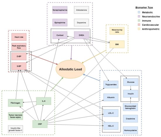Aldosterone, for example, appears to slowly decrease with aging [], although some individuals develop hyperaldosteronism, which might be due to increased ACTH stimulation of the adrenal glands, likely caused by genetic predispositions []. Serum concentrations of dehydroepiandrosterone (DHEA) and its sulfate (DHEA-S) have been reported to peak in young adulthood, followed by a steady decline over the following decades (between 40 and 80 years of age) by approximately 60%. Combined with increasing levels of cortisol [,,], and small, but significant, decreases in the serum concentrations of progesterone, it is suggested that adrenal functioning is particularly affected by aging [], and may actually constitute an alternative and composite allostatic (sub)structure (e.g., cortisol–DHEA ratio) in aging populations. Importantly, the steady increase in cortisol–DHEA ratio with aging is suggested to relate to immune deficits and in this way to the prevalence of infectious diseases [,]. For this reason, the contribution of the cortisol–DHEA ratio in quantifying allostatic load in elderly, despite the declining singular contribution of especially DHEA, may nevertheless appear relevant. Many other associated (bio)markers interact either within the specified domains of allostasis, or between them. C-reactive protein, for instance, has been suggested to interact with both metabolic and cardiorespiratory processes, apart from its established status as an immune marker (see Table 1 and Figure 5). Likewise, IL-6 and fibrinogen interact with neuroendocrine and cardiovascular processes, respectively. Representative examples on how such relationships with allostatic load can be captured in computational models are earlier presented [,].