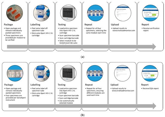 Processing of Verification and EQA panels. (a) Verification panel: same module must be used for each set of specimens. Verification panels are labelled with orange labels to remind users of this. (b) EQA panel: different modules must be used for each specimen. HIV: human immunodeficiency virus. VL: viral load. cp/mL: copies per milliliter. EQA: external quality assessment.