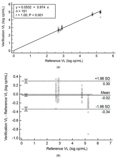 - Longo, S.; Bon, I.; Musumeci, G.; Bertoldi, A.; D’Urbano, V.; Calza, L.; Re, M.C. Comparison of the Aptima HIV-1 Quant Dx assay with the COBAS AmpliPrep/COBAS TaqMan HIV-1 v2.0 Test for HIV-1 viral load quantification in plasma samples from HIV-1-infected patients. Health Sci. Rep. 2018, 1, e31. [Google Scholar] [CrossRef]