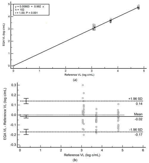 EQA Panel VL variation (log cp/mL) across different testing sites (n = 13) and EQA panels (n = 2). (a) Regression analysis for EQA Panels 1 and 2 (n = 102/104 specimens). (b) Bland-Altman agreement of the viral load results (n = 102/104 specimens), compared to the reference result obtained at panel preparation. EQA: external quality assessment. VL: viral load. cp/mL: copies per milliliter. SD: standard deviation.