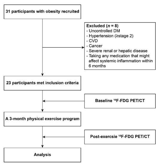 - Pahk, K.; Kim, E.J.; Joung, C.; Seo, H.S.; Kim, S. Exercise training reduces inflammatory metabolic activity of visceral fat assessed by 18F-FDG PET/CT in obese women. Clin. Encocrinol. 2020, 93, 127–134. [Google Scholar] [CrossRef]