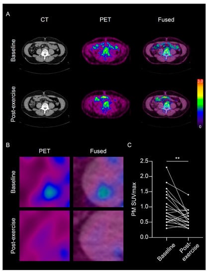 Physical exercise significantly attenuated the maximum standardized uptake value of psoas muscle (PM SUVmax). (A) Representative images of 18F-fluorodeoxyglucose (FDG) positron emission tomography/computed tomography (PET/CT) at baseline and post-exercise; (B) Magnified images of psoas muscle; (C) Change in PM SUVmax between baseline and post-exercise. ** p < 0.01.