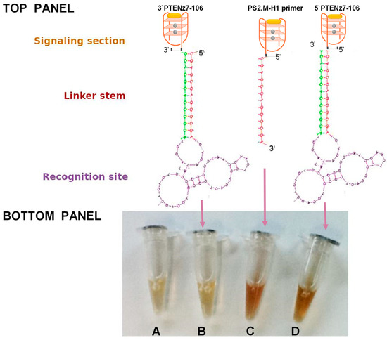 We first designed a dual aptamer, an aptamer with peroxidase activity and ability to recognize a specific target. This dual aptamer made only from single-stranded DNA consists of three parts (Figure 1, Top Panel): a recognition site (Aptamer) of the target. This region is single-stranded DNA formed by the 50 bases of the combinatorial sequences involved in the recognition site, a linker stem (primers). These constant regions contain the sequence of the primers, necessary for the amplification during the selection steps. The primers contain a region of 13 reverse complementary nucleotides, forming a fork with a constant and stable double helix with a melting temperature of 72 °C; and a signaling section (peroxidase DNAzyme) consisting of single strand DNA of 18 bases that forms a G-quadruplex with high affinity for hemin and thus, with peroxidase activity. This sequence named PS2.M was previously reported to have peroxidase activity [17].