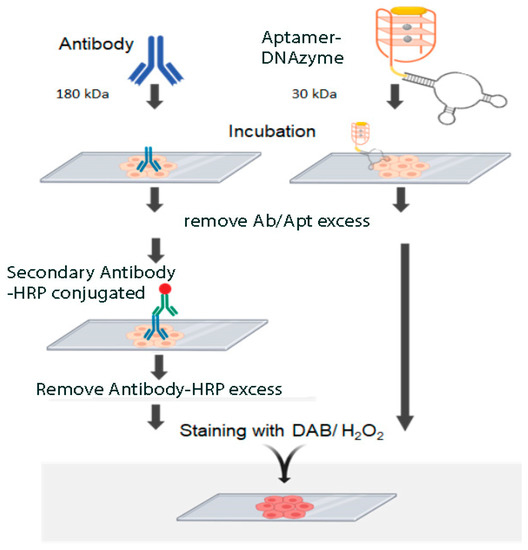 Aptamers could be any natural, synthetic, or modified polymer, most common nucleic acid and peptides that bind to a specific target molecule. Aptamers are highly resistant to degradation and can be chemically synthesized at a relatively low cost with high reproducibility. They can be customized to incorporate chemical modifications and can be joined with affinity tags or labels. [1,2,3,4,5]. Aptamers are a rising technology applied for detecting targets using random nucleotides with specific binding affinity. Target ligands for aptamers can be any molecule, including toxins and non-immunogenic agents. In August 1990, two groups proposed an inverse method for aptamer selection by suggesting that there would be an oligonucleotide that could be expected to recognize the target chosen if there is a large enough combinatorial library. One group used short sequences of single-stranded RNA to recognize small molecules [6]. Simultaneously, Tuerk and Gold published an iterative procedure of an “in vitro” selection process called “SELEX” (Systematic Enhancement of Ligands by Exponential Enrichment) to select an specific RNA aptamer that target and inhibit the bacteriophage protein T4 DNA polymerase [7]. Aptamers are highly resistant to degradation and can be chemically synthesized at a relatively low cost with high reproducibility. They can be customized to incorporate chemical modifications and can be joined with affinity tags or labels. In 1999, Jayassena proposed the aptamers as rivals for antibodies [8]. The same year, our group described the target switching method to produce a synthetic oligonucleotide capable of recognizing protein phosphatase 2A (PP2A) in the histological section prepared from murine cerebellum [9]. This aptamer–antibody parity was subsequently demonstrated for other aptamers specific for the tumor suppressor protein Cpd1/ANP32e [10]. Soon later, fluorescent aptamers were used for the detection of Endothelial Regulatory Protein Pigpen [11], the mucin MUC-1 [12], and Anp32e [13,14]. DNA aptamers were shown to compete with antibodies for ERK2-protein in cells [15]. Finally, in 2010, the aptamers were formerly presented as a histochemical tool using CD30 aptamers as a probe [16].