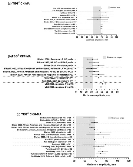All studies included in our review reported an increase in MA (values of MA >70 mm indicating hypercoagulability) for patients with COVID-19. Importantly, increased MA was observed in the citrated kaolin (CK)-MA channel, but also in the citrated functional fibrinogen (CFF)-MA channel—a quantifier of fibrinogen contribution to clot strength—supporting the involvement of fibrinogen in COVID-19 coagulopathy as described elsewhere [17,19,24]. One study of patients admitted to an intensive care unit (ICU) with suspicion of COVID-19 reported that elevated CFF-MA was observed in all patients with COVID-19, and that values were within normal reference ranges for all patients without COVID-19 [19]. These results were reflective of those from the other studies reporting marked increases in CFF-MA in this population [15,24], with Bliden et al. (2020) observing a stepwise increase in CFF-MA with worsening respiratory function [14,15]. Furthermore, elevations in CFF-MA reported in a single case study of a patient with COVID-19 who was ambulant while receiving treatment in a general isolation ward could suggest that quantification of fibrinogen via thromboelastography may be useful in early identification of COVID-19 coagulopathy prior to progression to severe disease [17].