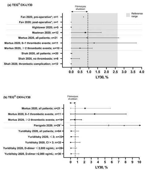 TEG LY30 values observed in patients with COVID-19. Grey bar shows the normal TEG reference range [10]. CK, citrated kaolin assay; CKH, CK with heparinase assay; LY30, clot lysis at 30 min after maximum clot strength. * TEG measurements recorded before and after endovascular stent graft exclusion of the aortic thrombus and right lower limb embolectomy following diagnosis of acute ischemic limb. † Measurements were repeated on two consecutive days in six patients. ‡ LY30 range reported: 0–54.3%. Data points are mean with standard deviation error bars for normally distributed data, or median with interquartile range error bars for data that were not normally distributed. Dotted lines separate different studies with different patient populations. Data are not directly comparable between studies.