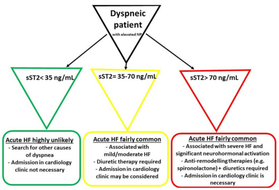 Another concept focuses on a “high-risk” cut-off value of 70 ng/mL, which is allegedly a better option in distinguishing dyspneic patients with more severe acute HF. Moreover, this category of patients should be immediately hospitalized, with the prompt initiation of more aggressive anti-remodeling therapies in the context of a significant activation of the neurohormonal and fibrotic pathways. In Figure 1 there is a proposed algorithm for the management of patients presenting in emergency room with dyspnea or other acute HF manifestations (e.g., swollen ankles), depending on their sST2 levels [65].