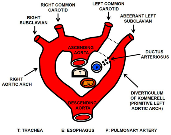 With the advances in CT techniques, detailed anatomies of aortic arch anomalies and their spatial relationships to adjacent organs are well displayed. The right aortic arch with ALSA is the most common variation of a right aortic arch [4,6]. According to the hypothetical double aortic arch theory [4], the anomaly is due to a regression of an arterial segment between the left common carotid and left subclavian arteries, as shown in Figure 1. The ALSA is the last branch of the arch. It takes an oblique retroesophageal course. Its proximal portion usually forms a Kommerell’s diverticulum, which is a remnant of the left arch. With the presence of ligamentum arteriosum connecting the diverticular portion of ALSA and the left pulmonary artery, this anomaly forms a vascular ring encircling the esophagus and the trachea. In this circumstance, the esophagus is compressed posteriorly by the diverticular portion of ALSA [7]. Esophageal compression may be aggravated in older individuals with progressed ectasia, tortuosity, and atherosclerotic change of the artery. The vascular pressure on the esophagus can create a fistula [8,9].