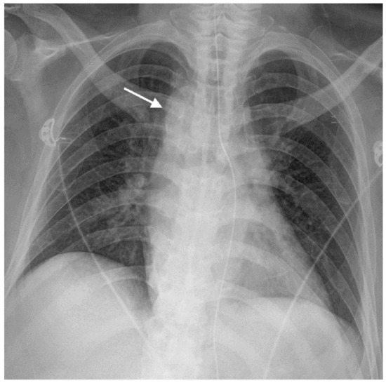 - Merchant, F.J.; Nichols, R.L.; Bombeck, C.T. Unusual complication of nasogastric esophageal intubation-erosion into an aberrant right subclavian artery. J. Cardiovasc. Surg. 1977, 18, 147–150. [Google Scholar]