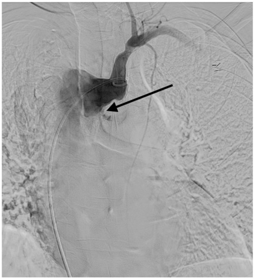 The arteriogram obtained after contrast injection at the ostium of the left subclavian artery confirmed the extravasation (arrow) from the diverticular segment of the aberrant left subclavian artery.
