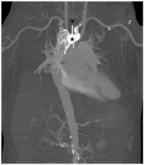 Maximum-intensity-projection image showing the result of the thoracic endovascular aortic repair and left subclavian artery coiling (star). An arrowhead indicates the nasogastric tube in the esophagus.