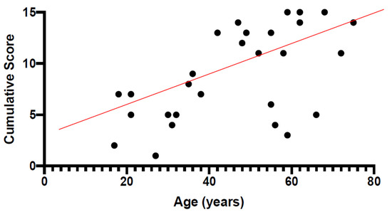 Figure 2 shows the CS from the right eye of each patient plotted as a function of age. Linear regression analysis showed that the score increases linearly with age, with a slope of 0.18/year. The r value is 0.65 (p < 0.001).