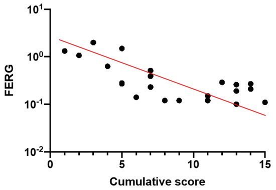 In Figure 3, the Focal Electroretinogram (FERG) Log 10 amplitudes are plotted as a function of the CS. It can be noted that, in our patients, disease severity stage, in terms of CS (0–15), was negatively correlated (Spearman’s) with Log 10 FERG amplitudes (rho = −0.72, p < 0.0001).