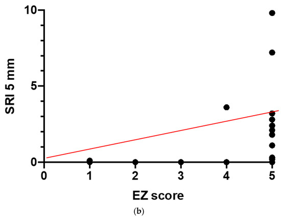 Figure 5a,b shows the results of correlation analysis between SRI and CS (Figure 5a) and EZ score (Figure 5b). SRI showed a positive correlation (Spearman’s) with both CS (with rho = 0.53; p = 0.01) and the EZ score (rho = 0.54, p = 0.007).