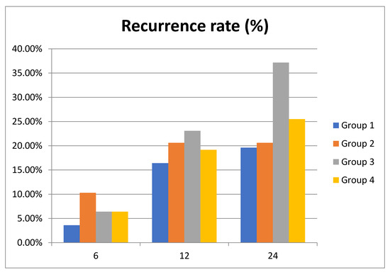 Recurrence rate showed an increase in groups 3 and 4 (52 patients, 66.7%; 21 patients, 44.7% respectively), with the highest percentage being recorded at 12 months in all groups (Table 4). At 6 months, the highest recurrence rate was recorded in group 2 (corrected hyponatremia). Overall, patients with acquired hyponatremia (group 3) had the highest recurrence rate of PE over the study period (Table 5). In fact, a decrease in serum sodium levels during the first year after an episode of acute PE is associated with a 16.7% risk of recurrence and remains high, at 14.1%, at 2 years. Group 2 patients, with correction of hyponatremia at 24 months, had a recurrence rate of 10.3% in the first year but at 2 years no recurrence episode was recorded (Figure 2).