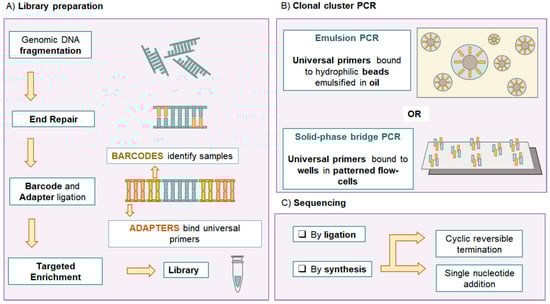 Next Generation Sequencing (NGS) experiment workflow. (A) Genomic DNA extracted from the samples is first processed in libraries. Purified genomic DNA is fragmented, then the fragments go through an end-repair phase and barcode and adapters ligation. Barcodes are unique sequences identifying specific samples within a run. Adapters are universal sequences used for PCR amplification and fragment capture. Some protocols require targeted enrichment (with PCR or biotin-streptavidin magnetic pulldown) to capture the desired fraction of the genome. (B) The libraries then undergo the crucial step of clonal cluster PCR amplification. This step leads to thousands of identical copies of the original DNA fragments in defined areas, allowing spatial resolution of localized, non-overlapping clonal clusters. This can be done with either emulsion-PCR, on hydrophilic beads emulsified in oil, or Solid-state bridge PCR, in the micro-wells of a patterned flow cell. (C) The sequencing reaction can be based on DNA ligase (sequencing by ligation) or DNA synthetase (sequencing by synthesis). The latter is the most common. Sequencing by synthesis can take place by Single Nucleotide Addition or by Cyclic Reversible Termination.