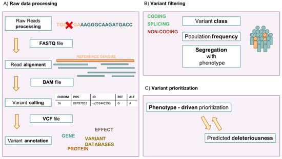 NGS bioinformatic workflow. (A) The sequencing reaction generates millions of short reads (40 to 400 nucleotides long). The reads are processed by marking duplicates and barcode and adapter sequences. Individual reads are retained in a FASTQ file. They are then aligned to the reference genome, generating a BAM file. Variants are identified (called) from nucleotide positions differing from the reference sequence, and gathered in a VCF file, consisting of a list of genomic coordinates with the reference sequences, the putative variants and quality scores. These variants are then annotated with information gathered from various databases, on variant frequency, gene(s) involved, gene products, predicted deleteriousness, reported pathogenicity or benignity. They are then manually analyzed by filtering (B) and prioritization (C). Variants with no impact on gene products, high frequency in the general population and not segregating with the phenotype are ruled out. The remaining variants are prioritized by various criteria, for example by potential relation to the phenotype or predicted deleteriousness.