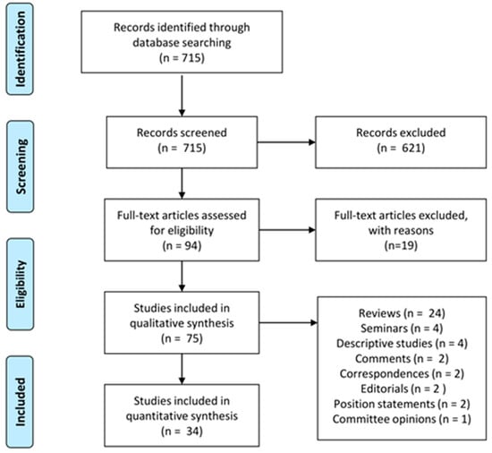 The review process is summarized as a PRISMA flow chart in Figure 3. The initial search yielded 715 results. After the application of abstract examination criteria 94 papers were retained, resulting in: n. 53 case studies, n. 24 reviews, n. 4 seminars, n. 4 descriptive papers, n. 2 editorials, n. 2 comments, n. 2 correspondences, n. 2 position statements, n. 1 committee opinion.