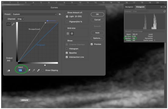 Third step: adventitia was normalized to a standard value of 190. Via curves (Image > Adjustments > Curves) the median value of selected adventitia was transformed into a standard value of 190 (Figure 4).