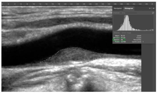 Fourth step: the entire image was normalized via curves with respect to the values previously obtained from normalization of adventitia. The plaque margins were outlined with the lasso tool and the median value showed on histogram was the GSM value (Figure 5).