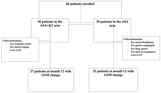 Plaque evolution was evaluated with the observation of the GSM trend over time. We considered as the primary endpoint a significant evolution in GSM value intended as a change of 15 points at 12 months’ follow-up. We considered current literature [,] describing the effect of statin therapy on plaque echogenicity assessed by a GSM score that reported a plaque echogenicity increase from 16% to 29% at 12 months’ follow-up. We considered significant (p < 0.05) a reduction of 8% in the GSM value, scored as 15 points on a 0–190 scale, taking into account the natural trend toward increased plaque echogenicity (≥16%, i.e., ≥30 points) in our study population, given statin therapy. We assumed a significant (p < 0.05) GSM score reduction at 12 months of 33% among patients in the ASA + K2 arm versus 5% among those in the ASA arm, resulting in a calculated total of 60 patients required (alpha 0.05; beta 0.2, power 0.8).