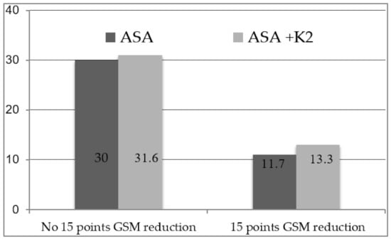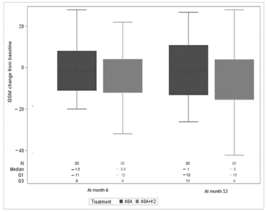Baseline GSM tended to be lower in the ASA + K2 arm than in the ASA arm (71.5 (64, 93) versus 89 (5, 113); p = 0.315). In the ASA + K2 versus ASA arm, GSM reduction tended to be greater at 6 months (−3.5 (−12, 4) versus −1.5 (−11, 8), p = 0.615) and 12 months (−5 (−15, 4) versus −1 (−13, 11), p = 0.641) (Figure 10). In the PP (per protocol) analysis, there were no statistical differences between arms with respect to GSM reduction.