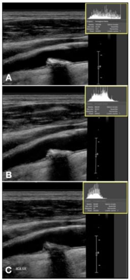 In monitoring subcritical carotid artery plaque, the main effort is made to detect precociously stenosis changes while barely considering its composition. The lipid and calcium contents are variably associated to the plaque vulnerability based on the concept of a linear relationship existing between echogenicity and plaque stability []. Several methods have been proposed to evaluate plaque composition from doppler US examination to more invasive computed tomography (CT) and magnetic resonance imaging (MRI), reserving histological examination in the case of surgery as a basis for comparison [,]. Doppler US examination avoids important CT and MRI limitations such as radiation exposure, claustrophobia, and high costs. Doppler US, in fact, is a fast, low-cost, and non-invasive examination which is optimal to identify, stratify, monitor, and assess the response to pharmacological therapy [,,]. Some of the advantages are lost throughout the subsequent computer-assisted post-processing analysis. It is a laborious and time-consuming procedure that makes it unsuitable for daily use. Therefore, a widespread application may be considered useless unless it is applied in specific settings such as monitoring a pharmacological therapy. Among doppler US post-processing analysis, several techniques, such as intimal media thickness, integrated back scatter, grey scale median, coarseness (heterogeneity of the plaque), have been described; their comparability is debated as well as the reliability with respect to more invasive methods []. Moreover, the preferential use of a method depends on different elements: clinical habits, instrumentation and facilities access, cost, and time limits. The GSM value is a standardized and reproducible parameter, even if doppler US acquisition is affected by several limitations such as two-dimensional imaging, artifacts due to the heavily calcified plaque, ability of the operator, inter-observer variability, and arterial wall or probe oscillation during image acquisition []. The maximum effort should be focused on reducing all possible bias, through a rigid protocol both on image’s acquisition and on post-processing analysis.