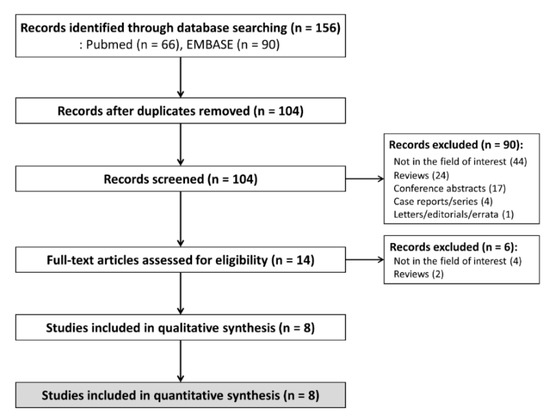 The systematic search identified 156 studies, and 104 were screened after removal of 52 duplicates (Figure 1). After the exclusion of 90 studies by screening of the title and abstract, and six studies by full-text reviews, eight studies were finally included in this systematic review and meta-analysis [10,11,12,13,14,15,16,17]. Because one study [14] investigating the interreader reliability of both CT and MRI had a population overlapping with that of another MRI study [13], the CT interreader reliability result was separately included from this study.