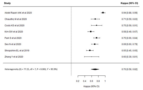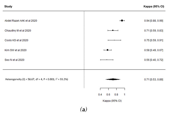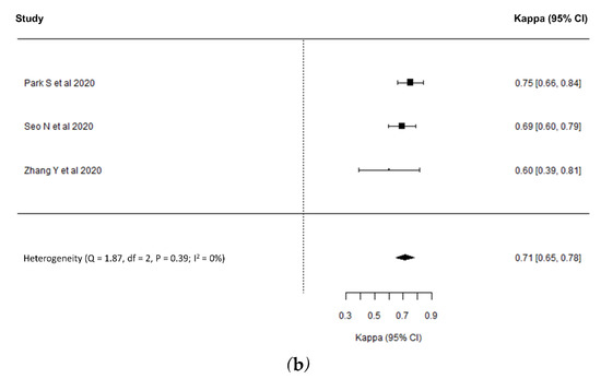 Regarding the imaging modality, the pooled κ values of MRI and CT were 0.71 (95% CI, 0.53–0.89, Figure 3a) and 0.71 (95% CI, 0.65–0.78, Figure 3b), respectively, indicating substantial interreader reliability for both MRI and CT. Substantial heterogeneity was noted in the interreader reliability of MRI (p < 0.001; I2 = 93.2%) but not in that of CT (p = 0.39; I2 = 0%).