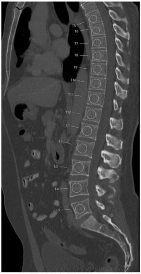 - Baum, T.; Müller, D.; Dobritz, M.; Rummeny, E.; Link, T.; Bauer, J.S. BMD measurements of the spine derived from sagittal reformations of contrast-enhanced MDCT without dedicated software. Eur. J. Radiol. 2011, 80, e140–e145. [Google Scholar] [CrossRef] [PubMed]