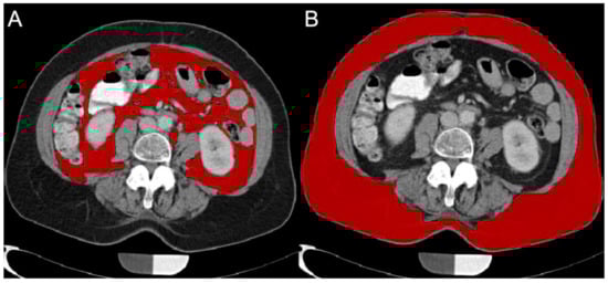 For SAT and VAT calculations, axial reformations with 5 mm slice thickness were used. Images were loaded in MITK (Medical Imaging Interaction Toolkit; mitk.org). The slice at the level of L4/5 was identified and two adjacent slices cranial and caudal, respectively, were included in the fat volume quantification. These regions were repeatedly used for SAT/VAT quantification in literature and pose standardized localizations for quantitative volumetric assessment [19,26]. SAT-VAT segmentation was performed manually assisted by a region growing based algorithm, operating threshold and pattern based. SAT volume defined as the volume circumscribed by the abdominal cutis as the outer border and the abdominal and paravertebral musculature as the inner border. The VAT volume was identified and quantified according to Sheu et al. [18]. The borders of the local musculature were identified and excluded from the SAT/VAT segmentation. The VAT was defined as the sum of all voxels within the inner border, which were neither muscle nor intestinal tissue and were in the adipose tissue range. SAT was defined as the voxels within the outer and inner border, the tissue from the cutis to the muscle tissue was included (Figure 2). All image analysis steps were performed by a radiologist with three years of experience.