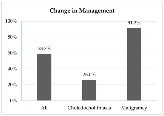 Change in management (as documented in the electronic health record) was defined as follows: avoidance of ERCP if EUS showed no choledocholithiasis; staging of malignancy leading to changes in multidisciplinary plan of care; and confirmation or rejection of a suspected diagnosis leading to changes in the plan of care.