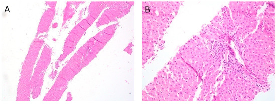 EUS-FNB liver at (A) 40× magnification, Hematoxylin and eosin (H&E) stain; (B) 200× magnification, H&E stain.
