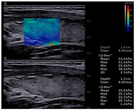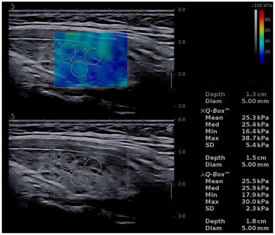 - Uysal, E.; Öztürk, M. Quantitative Assessment of Thyroid Glands in Healthy Children with Shear Wave Elastography. Ultrasound Q. 2019, 35, 297–300. [Google Scholar] [CrossRef]