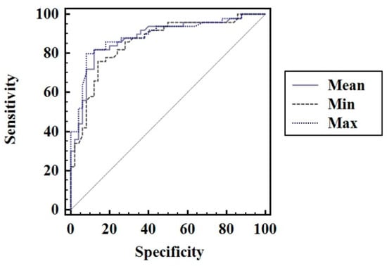 The optimal cut-off value defined as the highest sum of sensitivity(Se) and specificity (Sp) determined using the mean TS values for predicting the presence of CAT in children was >12.2 kPa (AUROC—0.88, Se—82%, Sp—88%, PPV—87.2% and NPV—83%). In the same population, when the highest TS values were used in the analysis, the following cut-off value for predicting CAT: TS >13.13 kPa (AUROC—0.89, Se—80%, Sp—92%, PPV—91% and NPV—82.1%) was obtained; when the lowest TS values were used in the analysis, the following cut-off value was obtained: TS > 11.53 kPa (AUROC = 0.85, Se—76%, Sp—86%, PPV—84.4% and NPV—78.2%) (Figure 4). The difference between their prediction accuracies is summarized in Table 3.