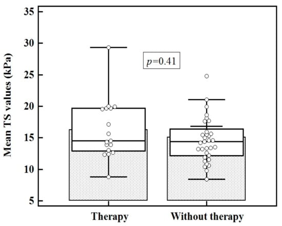 Of the children in the CAT group 17/50 (34%) were receiving LT4replacementtherapy. No differences were found between the mean TS values in children undergoing therapy compared to the TS in those without therapy (16.29 ± 4.75 kPa vs. 15.11 ± 4.79 kPa; p = 0.41) (Figure 5).