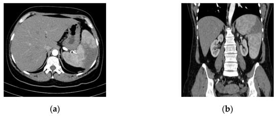 Abdominal/pelvic contrast-enhanced CT scan (Optiray™ 350). Splenomegaly and splenic infarction are depicted in (a) axial and (b) coronal sections.