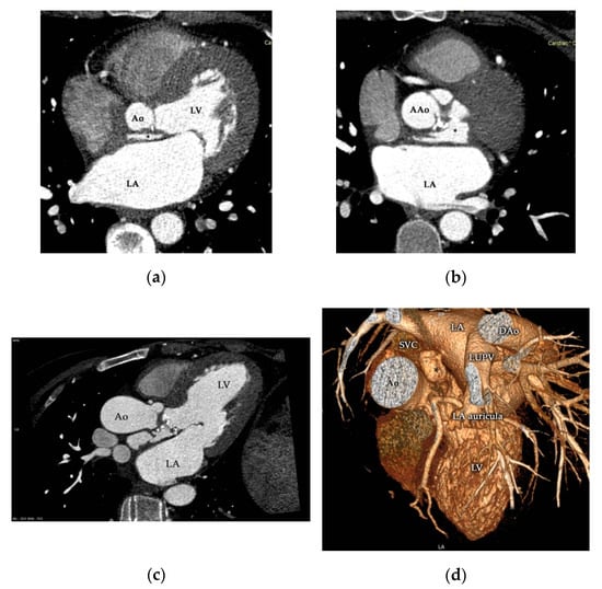 Contrast-enhanced ECG-gated multidetector-row cardiac computed tomography (MDCT) study of the aortic valve and ascending aorta during the cardiac cycle corroborated the presence of P-MAIVF (*) with the appearance of contrast media (a–c). Three-dimensional reconstruction (d) supported the aforementioned findings, and precise localization is clearly demonstrated. Ao—aorta, AAo—ascending aorta, DAo—descending aorta, LA—left atrium, LUPV—left upper pulmonary vein, LV—left ventricle, SVC—superior vena cava.