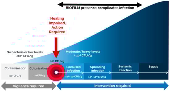 The Wound Infection Continuum. When wound bacterial loads exceed 104 CFU/g, intervention is required to address biofilm and prevent serious infection from occurring. (Modified from Woodmandsey and Roberts. Int Wound J 2018).
