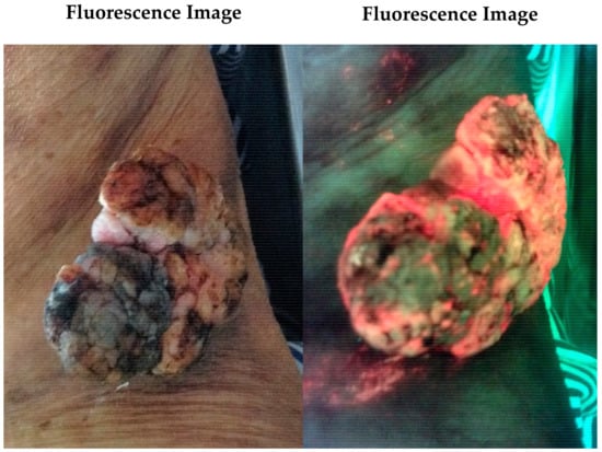 Case Study 1—Infected Cancerous Lesion. Fluorescence imaging of this skin cancer growth demonstrated areas of red bacterial fluorescence. Before excision of the growth, image-informed cleaning was performed to maximally remove bacterial loads and avoid wound infection. Microbiology: Staphylococcus aureus.
