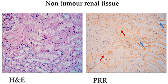 These RAS-dependent and -independent signalling pathways contribute to cancer initiation, so it was expected that PRR expression could be altered in tumour tissues [21]. Thus, increases in this protein have been described in pancreatic ductal adenocarcinoma [22,23], glioma [24,25], colorectal [26,27], breast [28] and endometrial cancer [29]. Taking into account that PRR exerts important functions in kidney physiology and that it takes part in inflammatory and fibrotic processes of this organ [12], changes in this protein can also be expected in kidney neoplasms. The Cancer Genome Atlas (TCGA) described high mRNA levels of PRR in RCCs when compared with the uninvolved part of the kidney [21]. The Human Protein Atlas (https://www.proteinatlas.org (accessed on 5 February 2021)) described PRR staining in RCCs; however, the analyses were limited to only 11 cases, which was insufficient to understand the association between this protein and tumour progression.