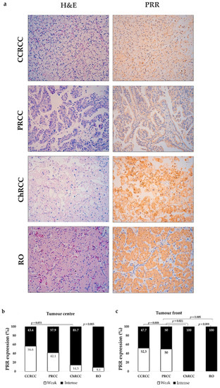 Nearly half of CCRCCs and PRCCs showed weak staining of PRR, whereas in ChRCC and RO, the staining was mainly intense. Significant differences were found between tumours from distal and proximal nephron both in the centre and tumour front (Figure 2b,c).