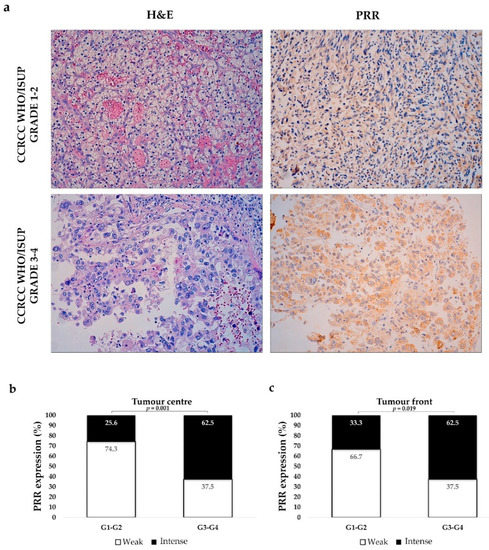 PRR expression according to tumour grade. Immunostaining at the tumour centre of low- and high-grade CCRCCs (a). Original magnification, ×250. H&E: Hematoxilin–Eosin. PRR staining intensity both at centre (b) and front (c) of tumours was grouped as weak and intense. Staining was more intense in high-grade CCRCCs. Chi-square test was used for data analysis.