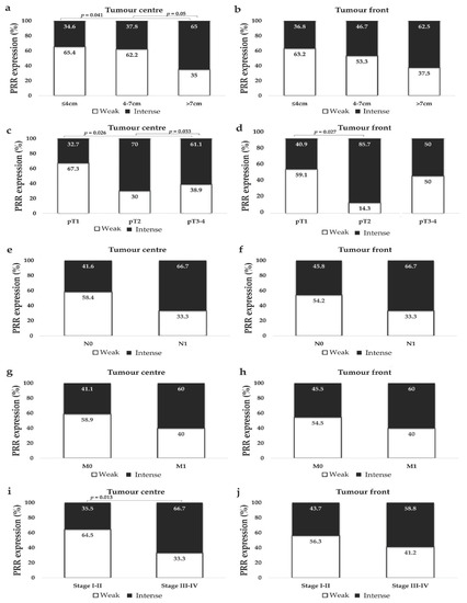 Immunohistochemical PRR staining according to CCRCC tumour size (a,b), local invasion (pT) (c,d), lymph node (N) (e,f) and distant metastasis (M) (g,h), and TNM Stage (i,j). PRR staining intensity was grouped as weak and intense. Chi-square test was used for data analysis. N0: No lymph node metastasis; N1: lymph node metastasis; M0: No distant metastasis; M1: distant metastasis.