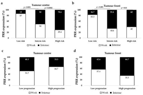 Immunohistochemical PRR staining according to UISS (mortality risk) (a,b) and SSIGN (disease progression) scales (c,d). PRR staining intensity was grouped as weak and intense. Chi-square test was used for data analysis.